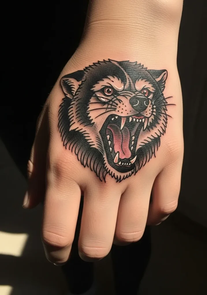 This American Traditional tattoo shows a roaring wolf s head placed boldly on the top of the hand. The classic design uses thick black outlines and deep shading to capture the wolf s fierce expression, with striking red details in the open mouth that bring it to life. The placement makes the piece instantly noticeable, giving it a raw, untamed feel that perfectly suits the bold energy of traditional tattooing.