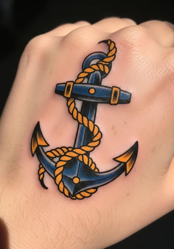 This hand tattoo features a navy-blue anchor wrapped tightly with a golden rope, done in thick, bold lines that define the classic American traditional style. The contrast between the cool blue and warm gold gives the design a rich, nautical feel, and the placement on the hand adds to its sailor-inspired charm.