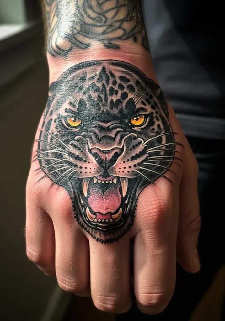 This fierce panther tattoo roars across the top of the hand, with vivid yellow eyes and exposed teeth that add intensity to its expression. The thick black shading and fine details in the fur make the design pop, while the pink tones in the mouth give it a lifelike edge.