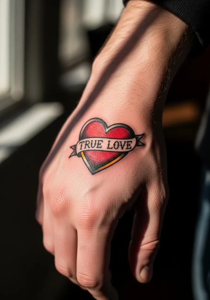 This small yet powerful hand tattoo features a red heart with a banner that reads TRUE LOVE. The soft shading gives it that authentic vintage look, and the yellow accent adds a warm touch. The size is just right for the hand, making it pop without being overwhelming.