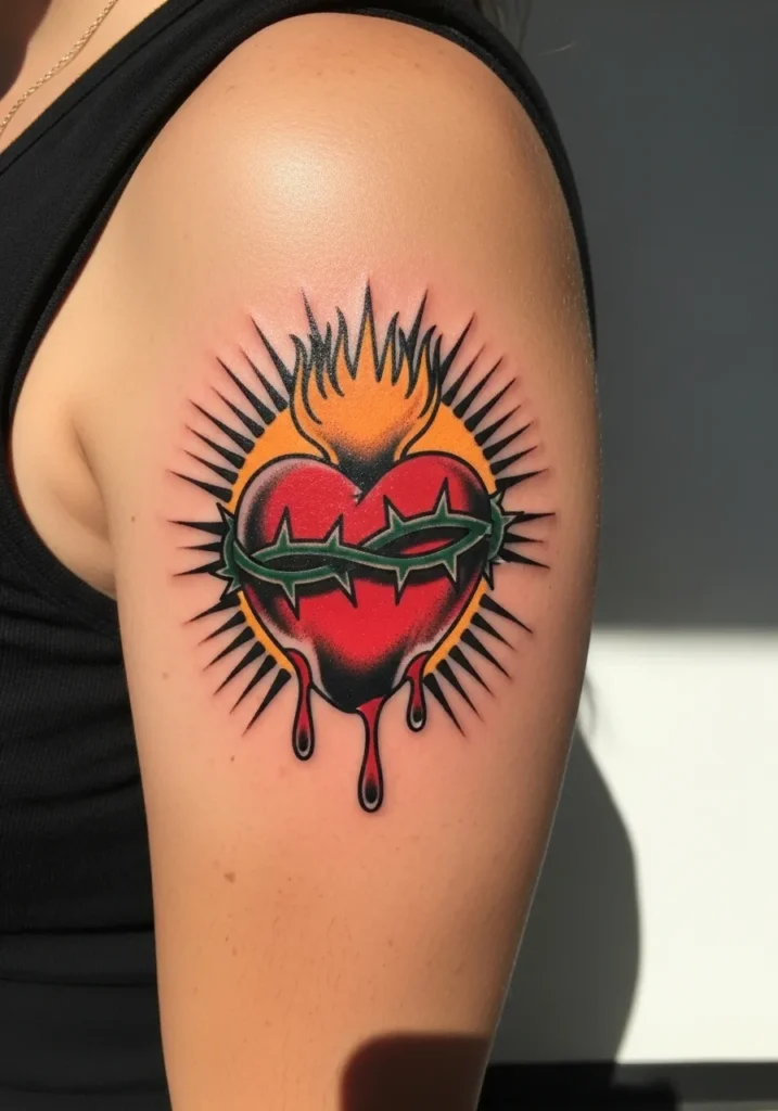 To me, this tattoo captures emotion in its purest form pain, passion, and faith all in one. It s fiery and dramatic in the best way, and I love how the symbolism hits hard without losing that classic charm.