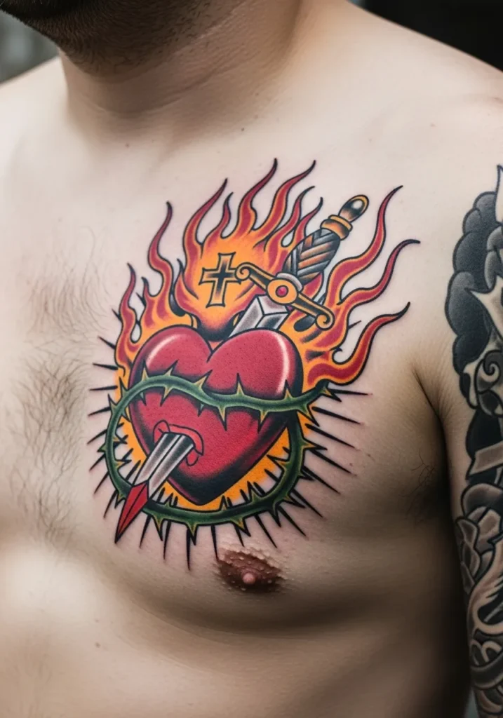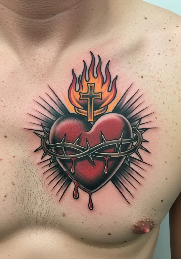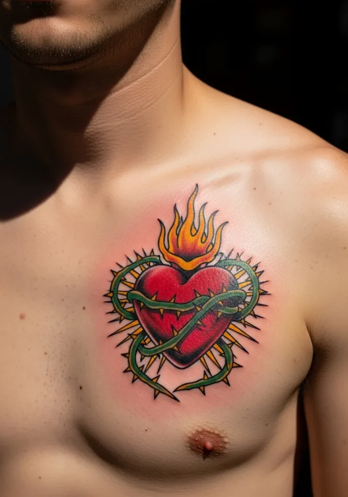 This radiant chest tattoo features the sacred heart surrounded by a crown of thorns, glowing flames, and golden rays. The bright red heart stands out against the green thorns, and the fiery top adds an almost divine glow. The placement right over the heart gives it an emotional and spiritual touch.