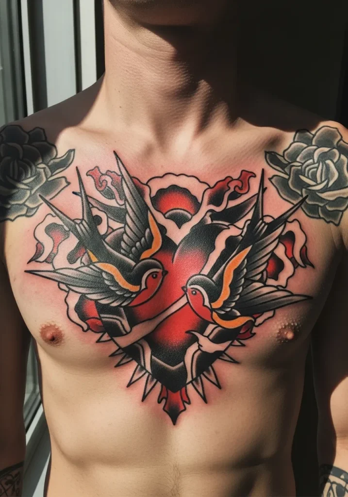 This large chest tattoo is pure Americana. A bright red heart sits at the center, surrounded by two graceful swallows mid-flight. The deep black shading and warm orange tones bring such rich contrast, and the piece flows perfectly with the shape of the chest. The heart glows against the skin, creating that signature old-school look that never goes out of style.