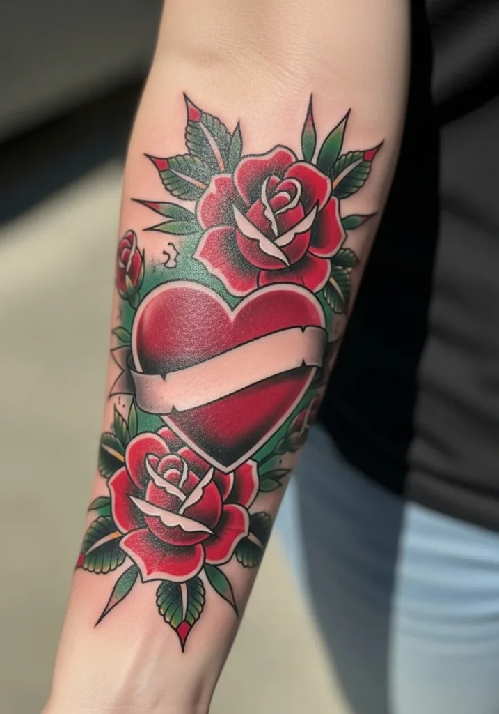 This forearm tattoo features a bold red heart surrounded by blooming red roses and lush green leaves. The clean black outlines and rich shading give it that true American traditional feel, and the blank banner across the heart leaves space for a name or word that means something special. The layout flows naturally down the arm, making it a perfect statement piece.