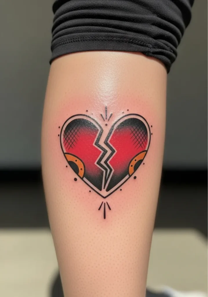This small broken heart tattoo is as simple as it is bold. The bright red shading fades into black edges, outlined in thick black lines with small dotted details. Placed on the leg, it s a compact design that feels both striking and clean. The cracked center tells the whole story with just one sharp line.