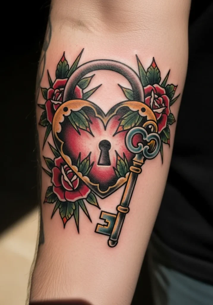 This design shows a golden heart-shaped lock with a vintage key beside it, wrapped in lush red roses and green leaves. It s placed on the upper arm, and the gold and red tones give it that rich, traditional warmth. The thick lines, subtle black shading, and crisp color work make it look like something straight out of a classic tattoo flash book.