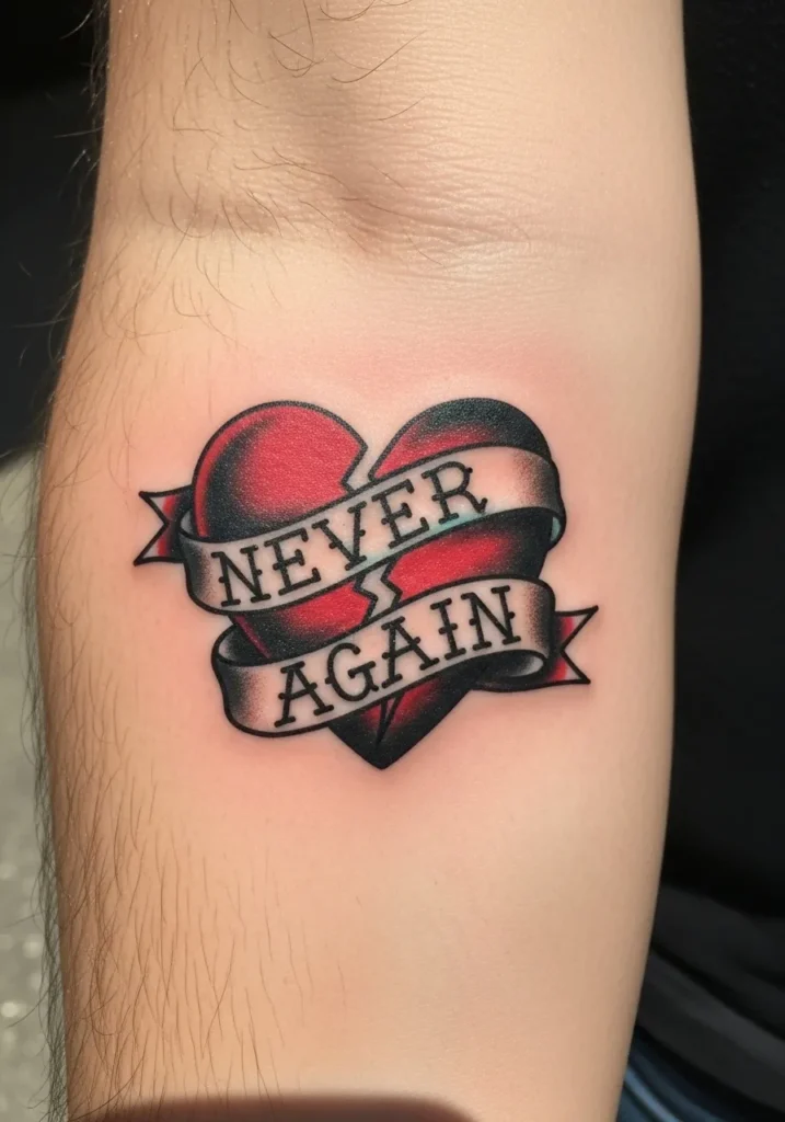 This small tattoo features a red broken heart wrapped in a white banner that reads NEVER AGAIN. The piece is compact and clean, with bold black outlines and soft shading that give it that perfect vintage look. It s placed neatly on the inner arm, where it s both subtle and personal.