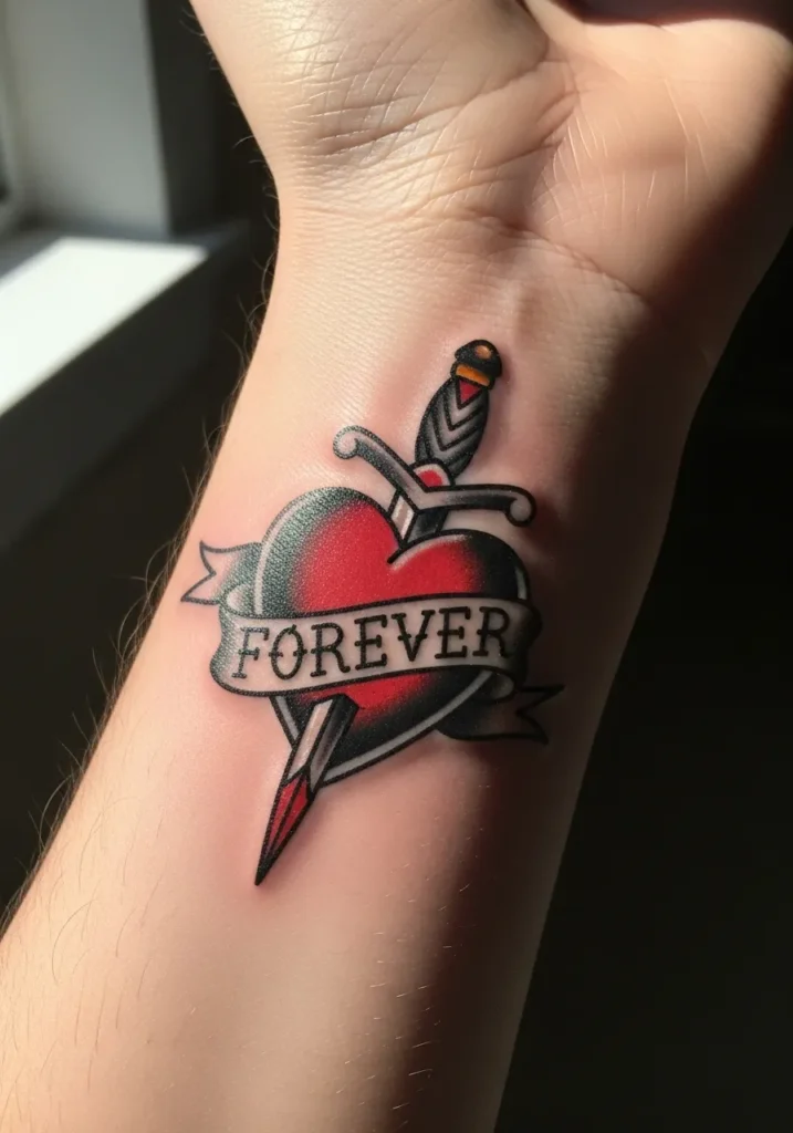 This small wrist tattoo features a red heart pierced by a dagger, wrapped with a banner that reads FOREVER. The clean black lines, smooth shading, and compact placement make it a perfect old-school piece that still feels personal. The glint of red on the blade adds a hint of drama while keeping that polished, traditional look.