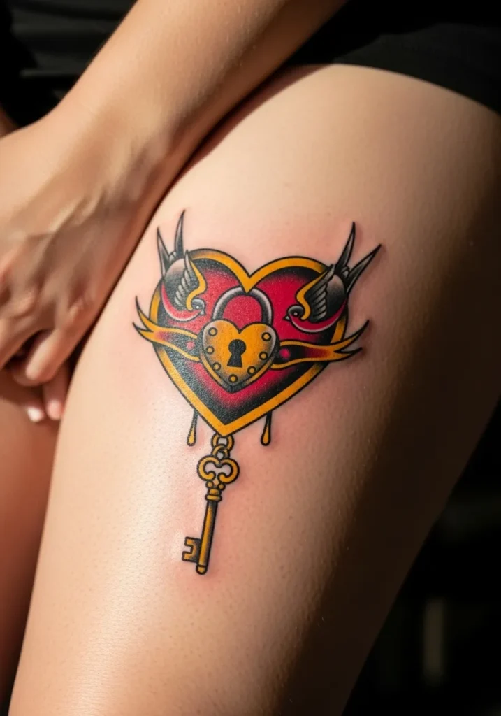This thigh tattoo features a golden heart-shaped lock with tiny swallows on either side, a key hanging below, and warm red and yellow tones that make it glow. The black outlines tie it all together, giving it that traditional look that never fades out of style.