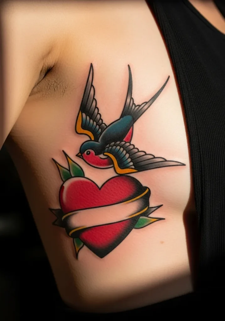 This ribcage tattoo shows a graceful swallow hovering above a red heart wrapped with a soft yellow-edged banner. The design sits perfectly along the body s curves, and the blue and gold tones in the bird add such a pretty pop of color. The bold outlines and rich shading make it unmistakably traditional.