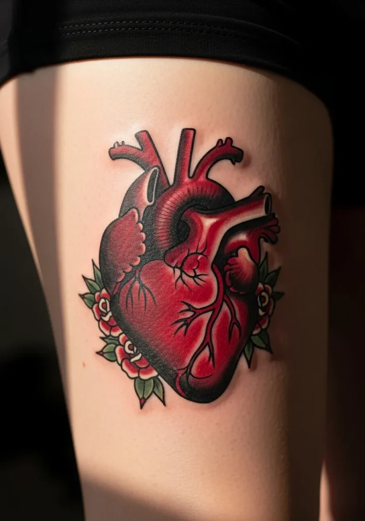 This thigh tattoo features a realistic anatomical heart done in American traditional style, surrounded by small red roses and green leaves. The bold red shading gives it a deep, lifelike dimension, while the clean black outlines keep it classic. It s a medium-sized design that looks powerful against the skin, balancing realism with that timeless old-school charm.