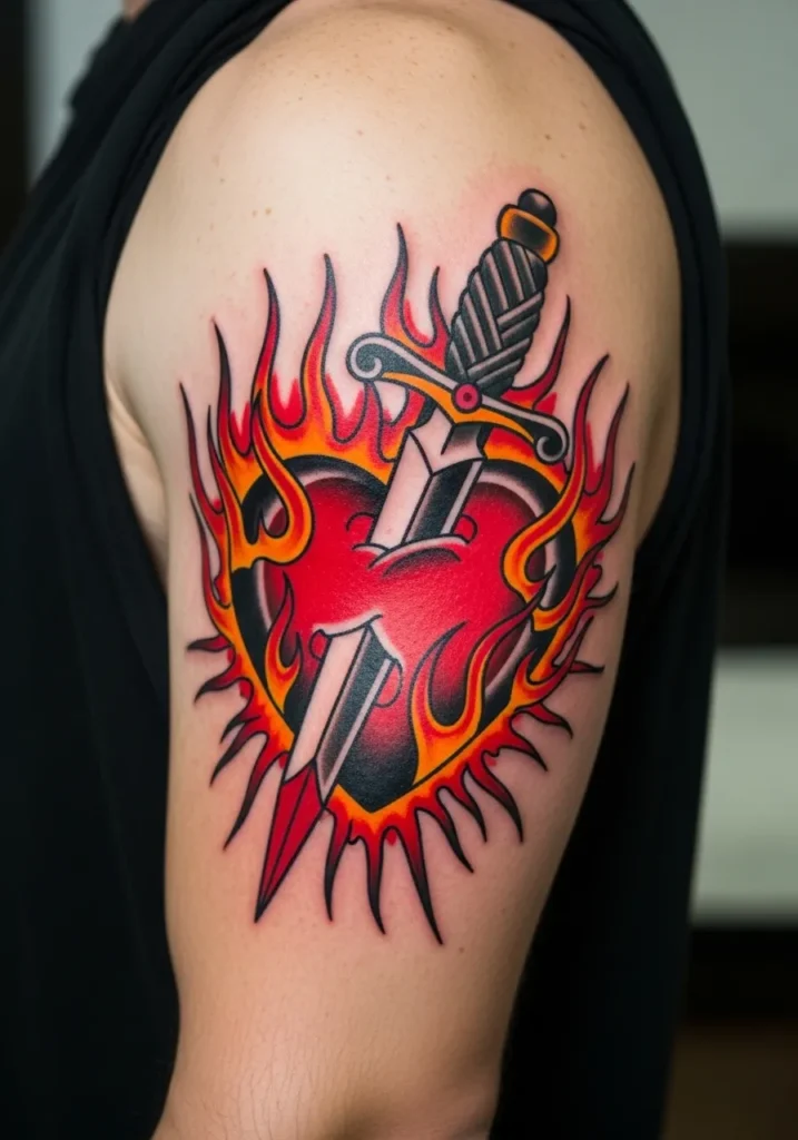 This bold upper-arm tattoo shows a dagger striking through a fiery red heart engulfed in bright yellow and orange flames. The heavy black outlines and vivid colors give it that unmistakable American traditional energy. The placement on the arm makes it a show-stopper, especially with the flames wrapping naturally around the muscle.