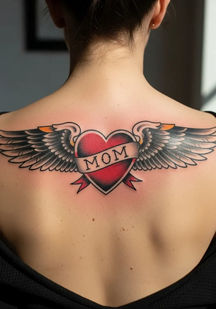This stunning back tattoo features a heart with detailed wings stretched across the shoulders. The heart is bright red with smooth shading, and a banner across it proudly reads MOM. The wings are done in traditional gray tones with a hint of orange, giving the design movement and warmth.
