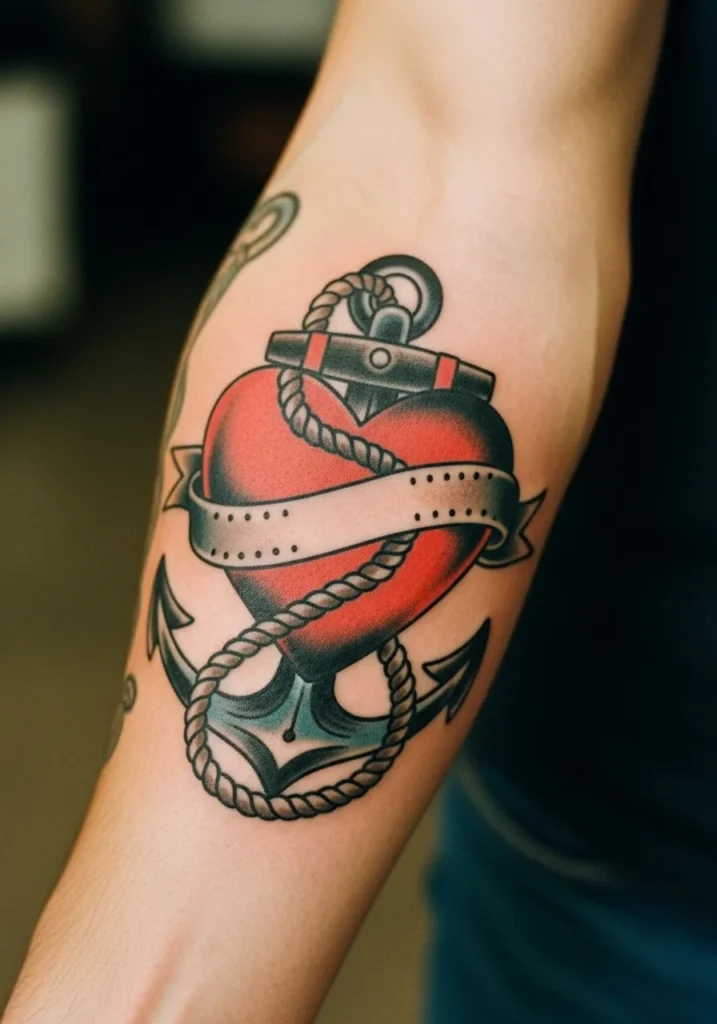 This arm tattoo combines a bright red heart with a traditional navy anchor wrapped in rope. The clean banner across the heart is ready for a name or word, and the shading gives it that perfect vintage tattoo shop feel. It s a strong, balanced piece that sits beautifully on the forearm.