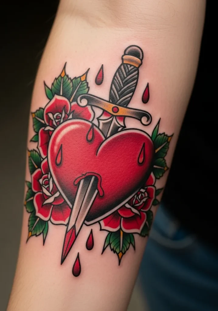 This bold American traditional tattoo shows a dagger piercing a bright red heart, surrounded by deep green leaves and vivid red roses. It s placed neatly on the arm, and the shading gives it that perfect old-school depth. The black outlines are crisp, the drops of blood add intensity, and the classic color palette makes it pop beautifully against the skin.