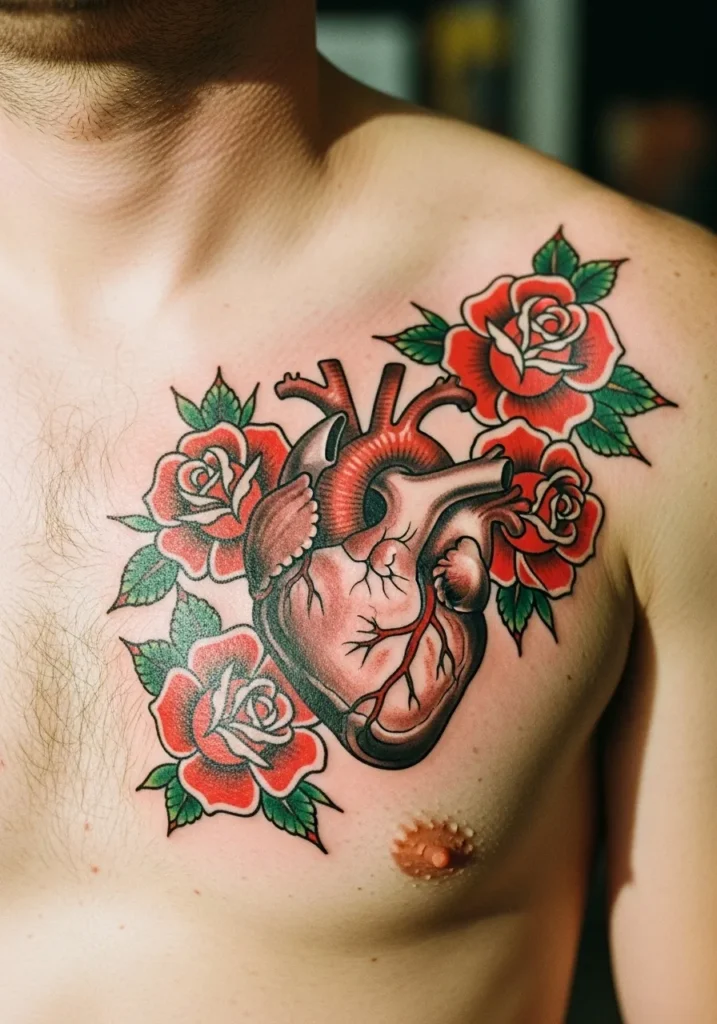 This chest tattoo features a realistic anatomical heart surrounded by red roses with green leaves. The mix of deep reds, blacks, and muted highlights gives it that traditional-meets-realistic twist. It s detailed, balanced, and placed right where the heart beats literally and symbolically.