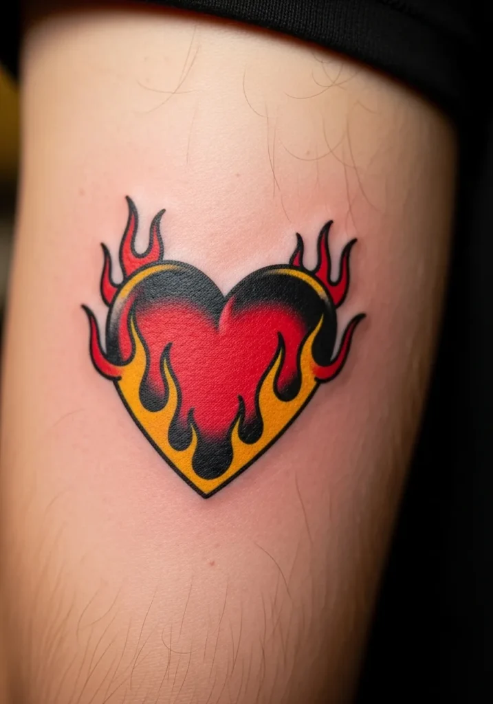 This fiery heart tattoo brings major attitude. The red and black heart is surrounded by vibrant yellow and orange flames, giving it a hot, rebellious edge. It s placed on the upper arm, and the bold contrast between the warm colors and crisp outlines makes it look alive with energy.