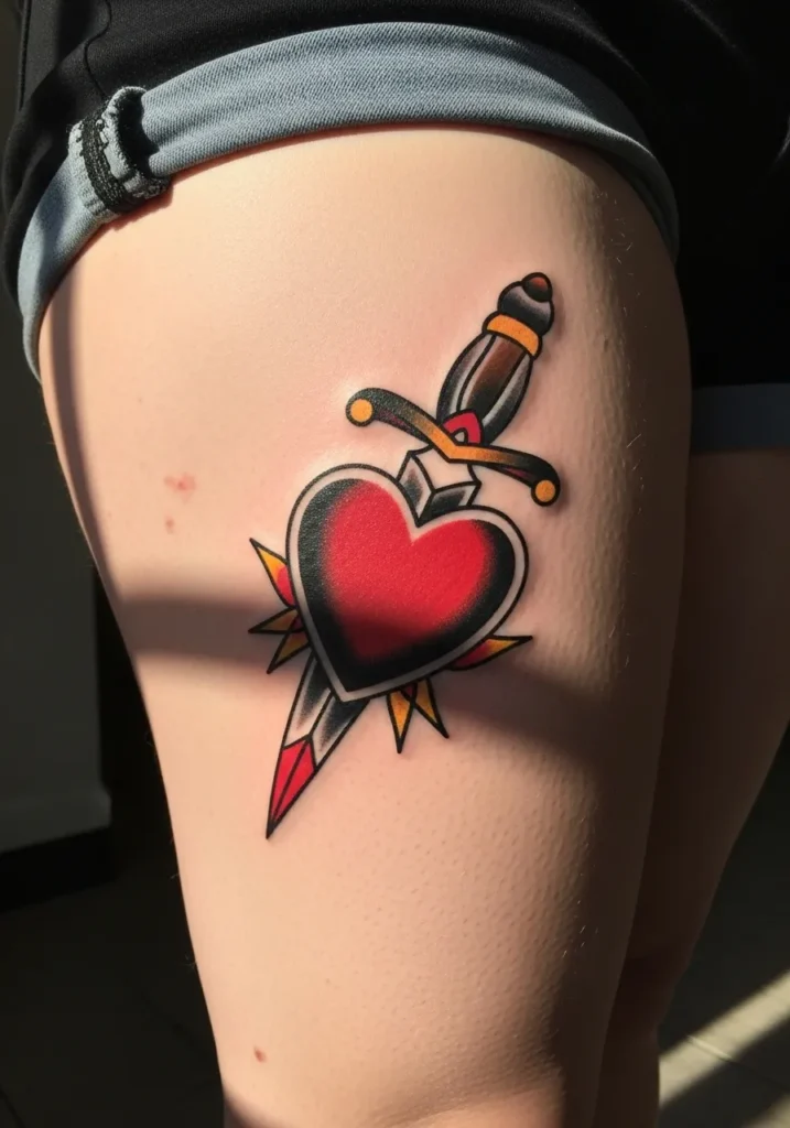 This tattoo on the thigh shows a bold red heart pierced by a dagger, surrounded by golden highlights that make it look alive. The smooth gradient from red to black gives it depth, while the traditional yellow and orange accents add warmth and punch. It s a clean, medium-sized piece that looks perfectly balanced.