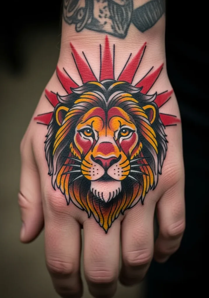 This hand tattoo is small but seriously striking. The lion s face is centered perfectly on the back of the hand, surrounded by red sunburst rays that make the whole design pop. The golden mane transitions into fiery tones, and the bold black outlines give it that unmistakable old-school feel.
