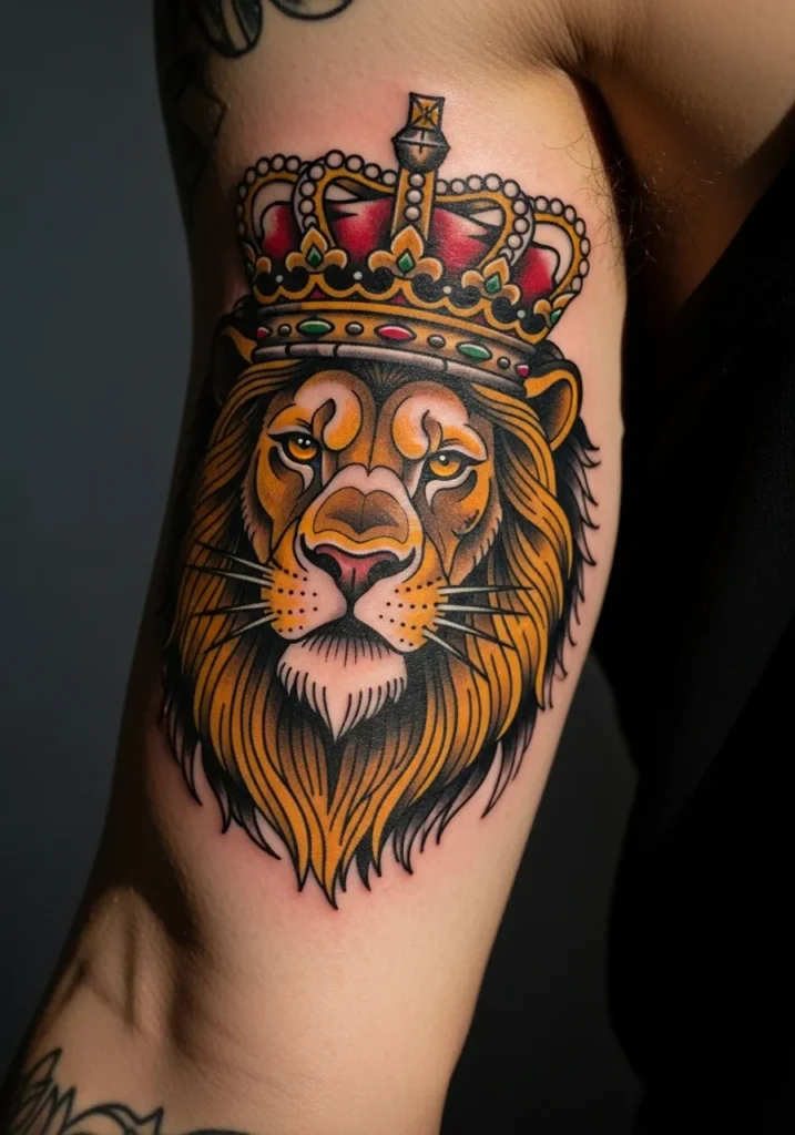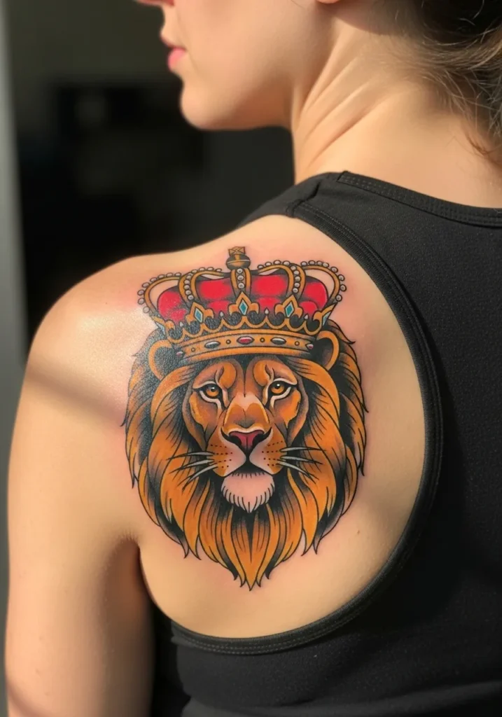 This shoulder piece feels like pure royalty. The lion s face is calm and composed, with a grand red and gold crown resting perfectly atop its mane. The classic shading gives it depth, and the sunlight reflecting off the ink makes the rich tones glow beautifully on the skin.