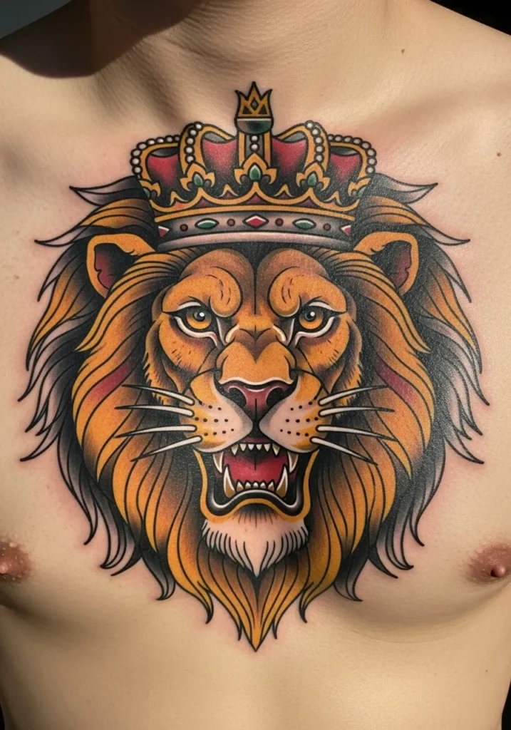 This chest tattoo features a majestic lion wearing an ornate crown with jeweled details. The warm oranges and golds in the mane blend beautifully with the bold reds of the crown, while the crisp outlines make the entire piece feel clean and regal.