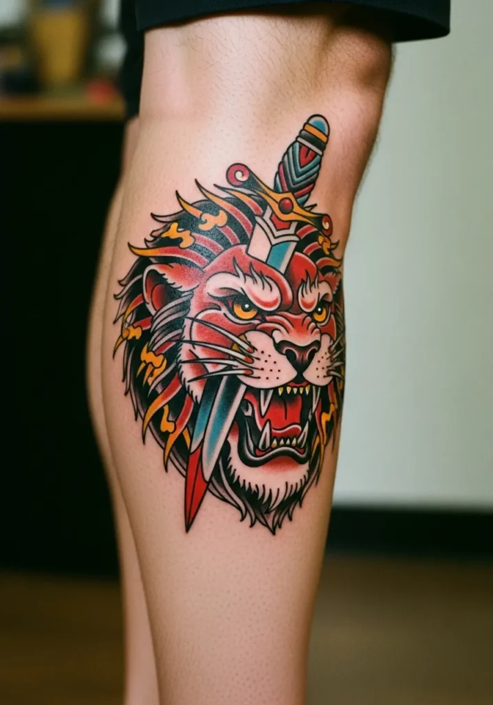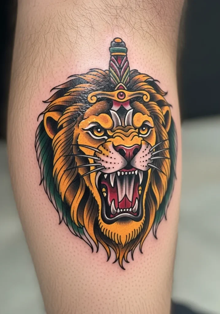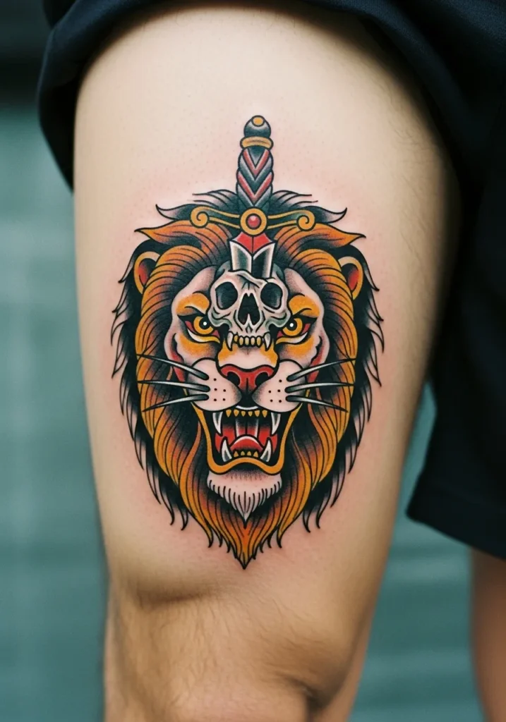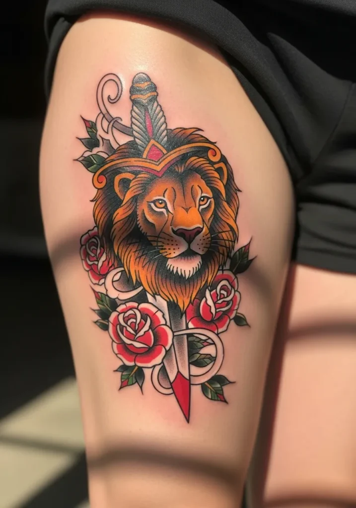 This large thigh tattoo commands attention with its vibrant mix of red, gold, and blue hues. The classic lion head is shown mid-roar, pierced by a dagger that adds a dramatic edge. The bold outlines and flame-like mane details give it that unmistakable American Traditional punch.
