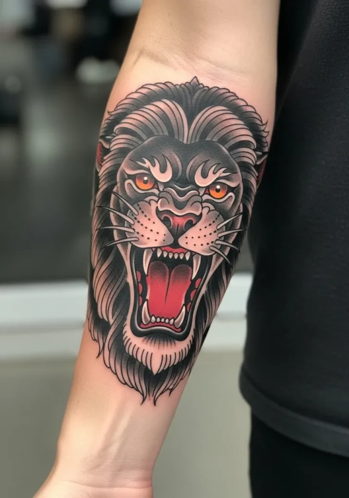 This bold American Traditional lion tattoo takes over the forearm with confident placement and stunning detail. The design features a roaring lion with a jet-black mane and fiery orange eyes that immediately draw attention. The red tones inside the open mouth give it that fierce, alive look, while the thick black outlines and solid shading make the whole piece pop beautifully against the skin.