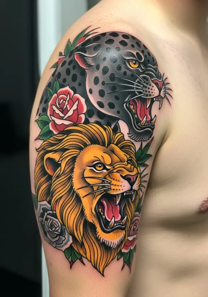 This shoulder tattoo shows a roaring lion paired with a snarling black panther, surrounded by vibrant roses in shades of red and green. The contrast between the golden lion and dark panther makes this piece absolutely magnetic. The strong outlines and rich shading tie it all together in true American Traditional fashion.