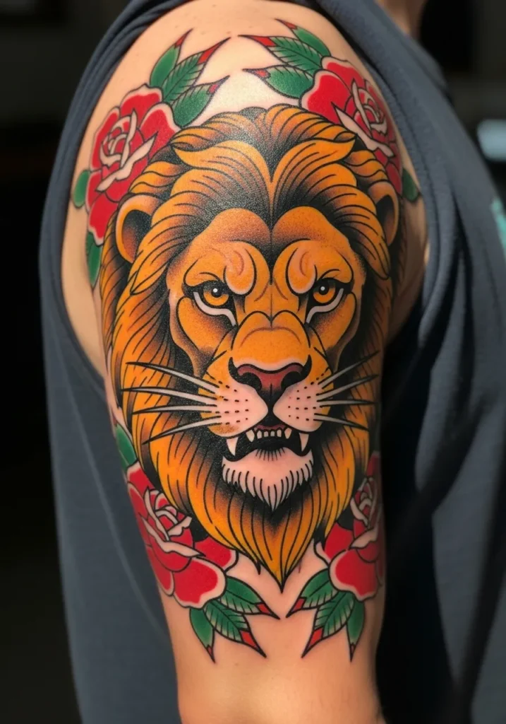 This classic upper arm design features a bold lion s head surrounded by blooming red roses and green leaves. The golden tones of the mane contrast beautifully with the rich reds, creating a perfectly balanced and timeless composition.