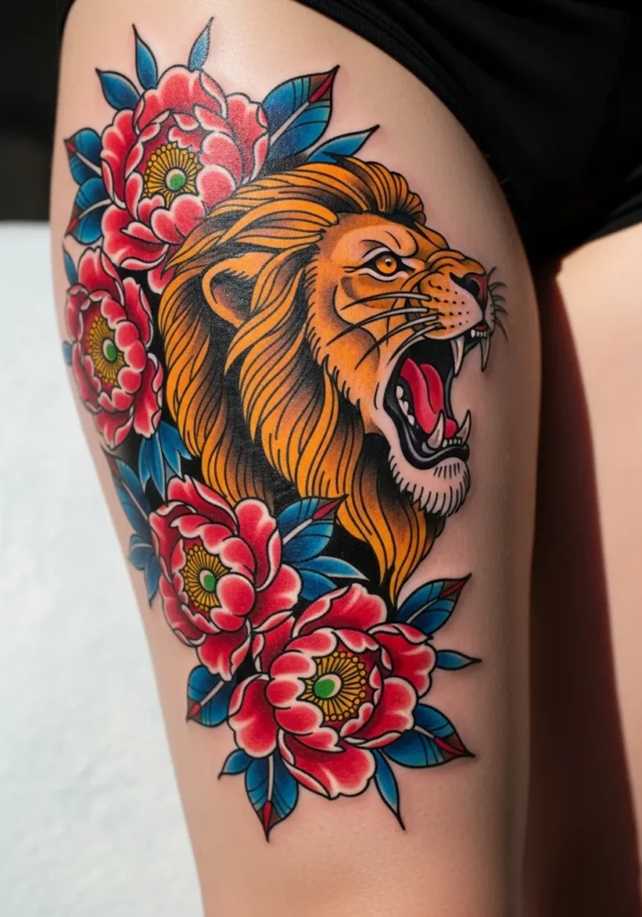 This thigh tattoo is bursting with life and color. The roaring lion s head sits among large red and blue peonies that create a vivid floral backdrop. The shading is beautifully smooth, and the bold outlines tie every element together perfectly.
