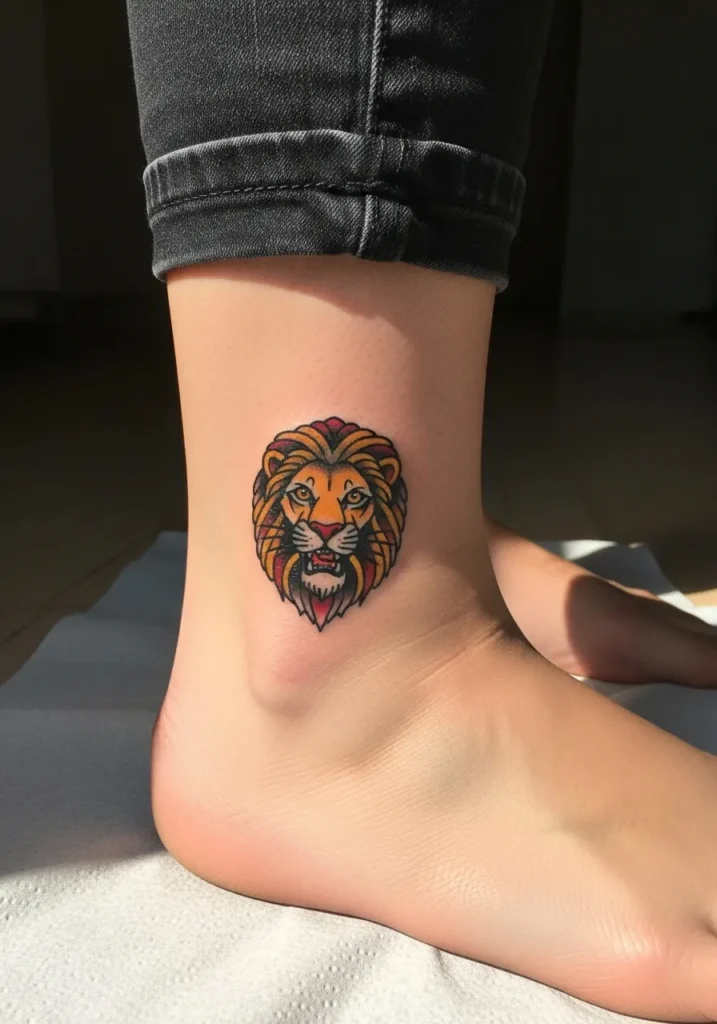 This tiny ankle tattoo proves that even small designs can pack a punch. The lion s head is bright and bold, with golden and red tones that stand out beautifully on the skin. Despite its size, it keeps that classic American Traditional boldness with thick lines and rich shading.