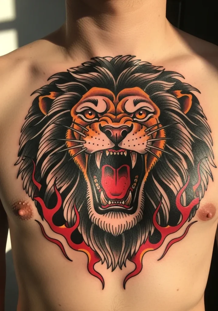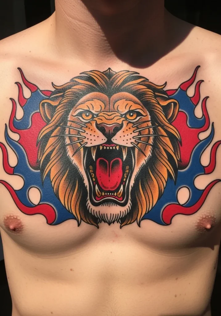 This chest tattoo features a roaring lion framed by red and blue flames, filling the space with color and power. The bold use of contrasting tones gives it that fiery energy, while the classic outlines and shading make it unmistakably American Traditional.