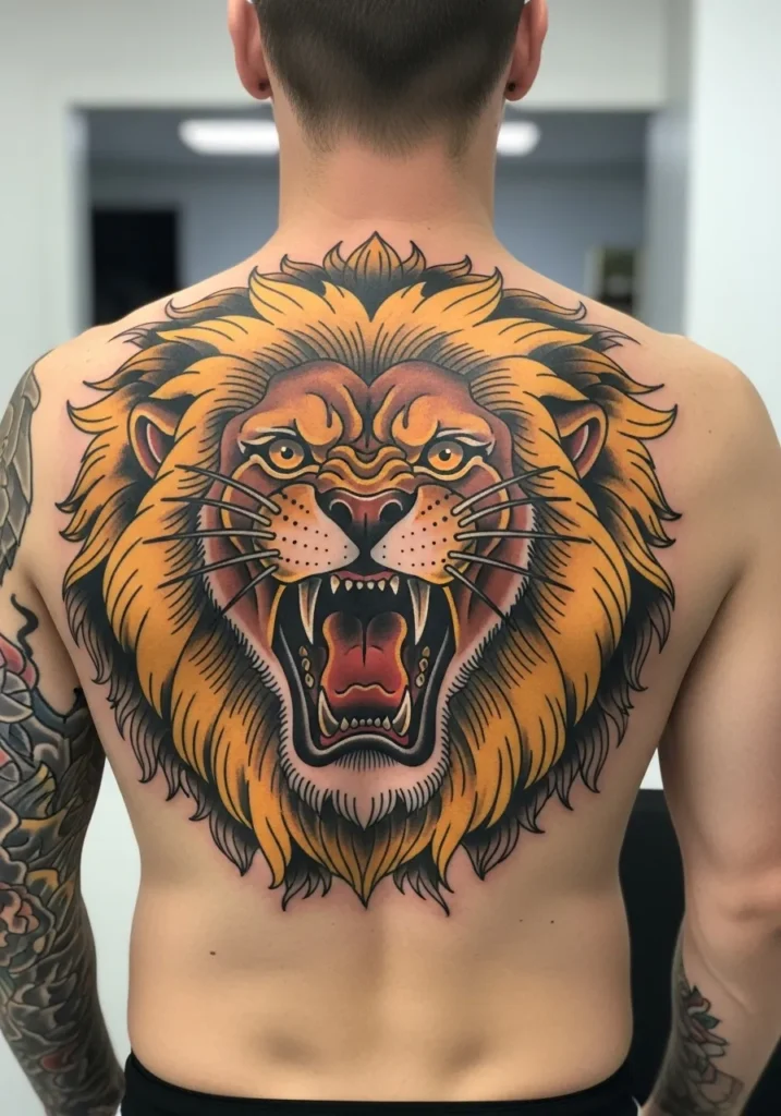 This full-back tattoo is a showstopper, featuring a massive roaring lion that dominates the entire space. The golden mane flows out in perfect symmetry, while bold black outlines and deep red tones inside the open mouth make the design pop. The crisp linework and strong shading give it that flawless American Traditional look, making it feel both fierce and timeless.