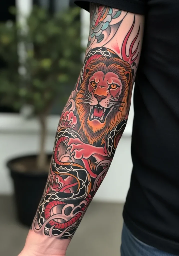 This sleeve tattoo brings the lion to life among swirling red and black patterns that give it an intense, dynamic energy. The lion s face is framed by vibrant orange tones and surrounded by intricate designs that make the entire arm look like a moving story. It s large, detailed, and full of personality.