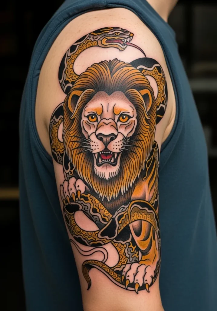 This arm tattoo captures a fierce lion wrapped in the coils of a massive snake. The intricate detailing of both creatures brings the design to life, with golden and black tones creating a strong sense of depth. The composition flows beautifully along the upper arm, making it a perfect choice for a larger statement piece.