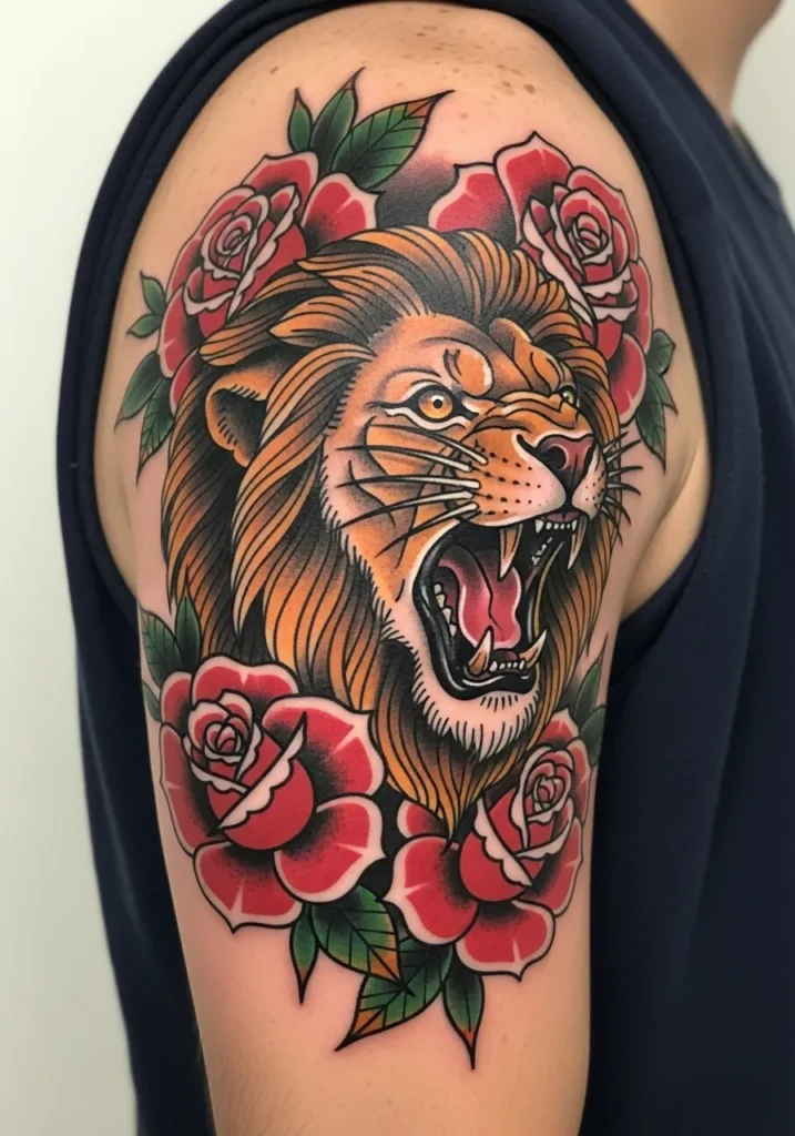 This shoulder tattoo pairs a roaring lion with a cluster of bold red roses for a striking mix of power and beauty. The warm tones of the lion s mane blend beautifully with the deep greens and reds of the flowers. It s a full, balanced design that stands out without feeling overcrowded.