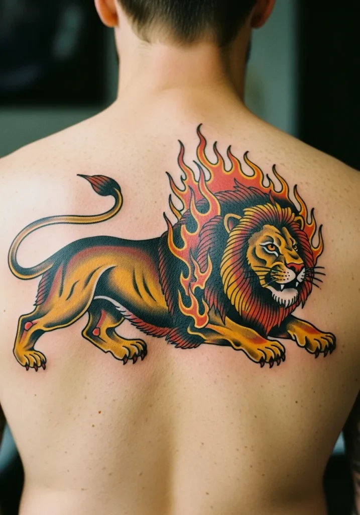 This tattoo transforms the back into a fiery masterpiece. The full-bodied lion appears mid-stride, with flames rising from its mane in shades of red, orange, and gold. The smooth blending and sharp outlines give it that unmistakable American Traditional flair.