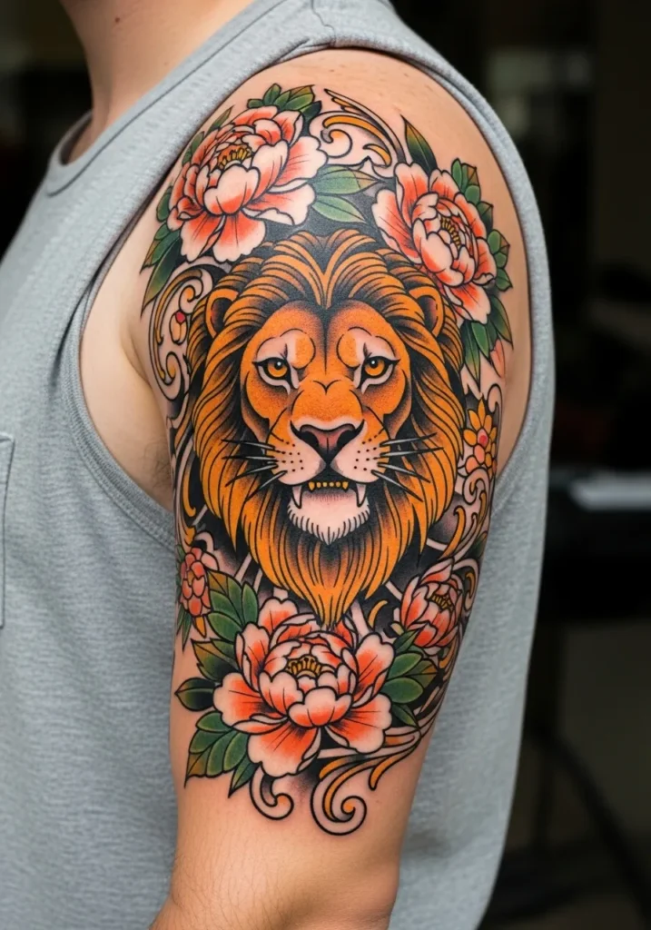 This upper arm tattoo combines a regal lion s face with blooming peonies for a softer yet commanding design. The orange and gold tones of the lion s mane mix beautifully with the pastel petals, framed by deep green leaves. It s large, detailed, and full of contrast that makes every element stand out.