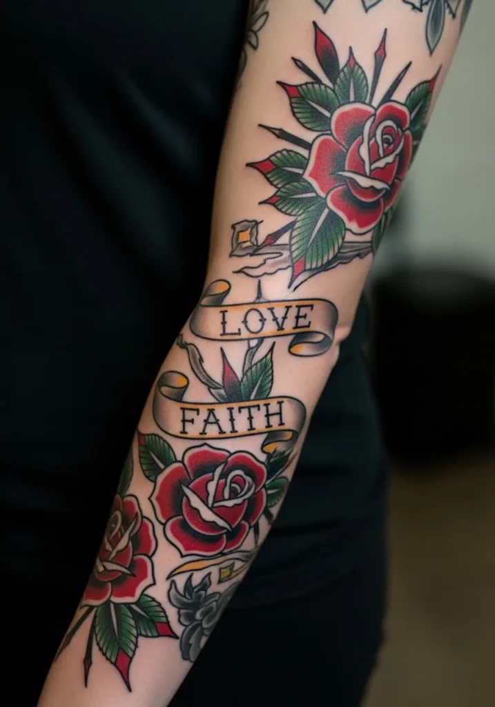 This forearm tattoo is a beautiful tribute piece featuring bold red roses, crisp green leaves, and banners reading LOVE and FAITH. The design flows seamlessly down the arm, keeping everything clean and bold with thick outlines and traditional shading. The layout feels balanced and elegant without losing that vintage toughness.
