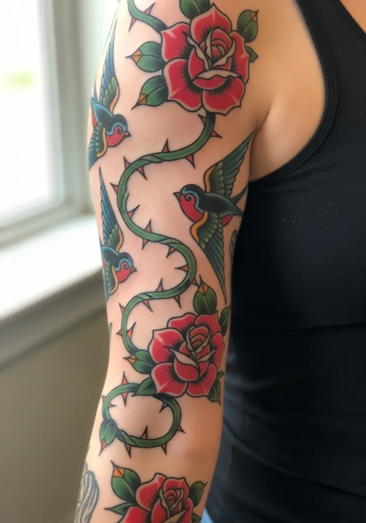 This tattoo wraps around the arm with vibrant red roses, green leaves, and a twisting vine of thorns. Blue swallows weave through the design, creating motion and harmony. The colors are rich and bold, giving that unmistakable American traditional punch.