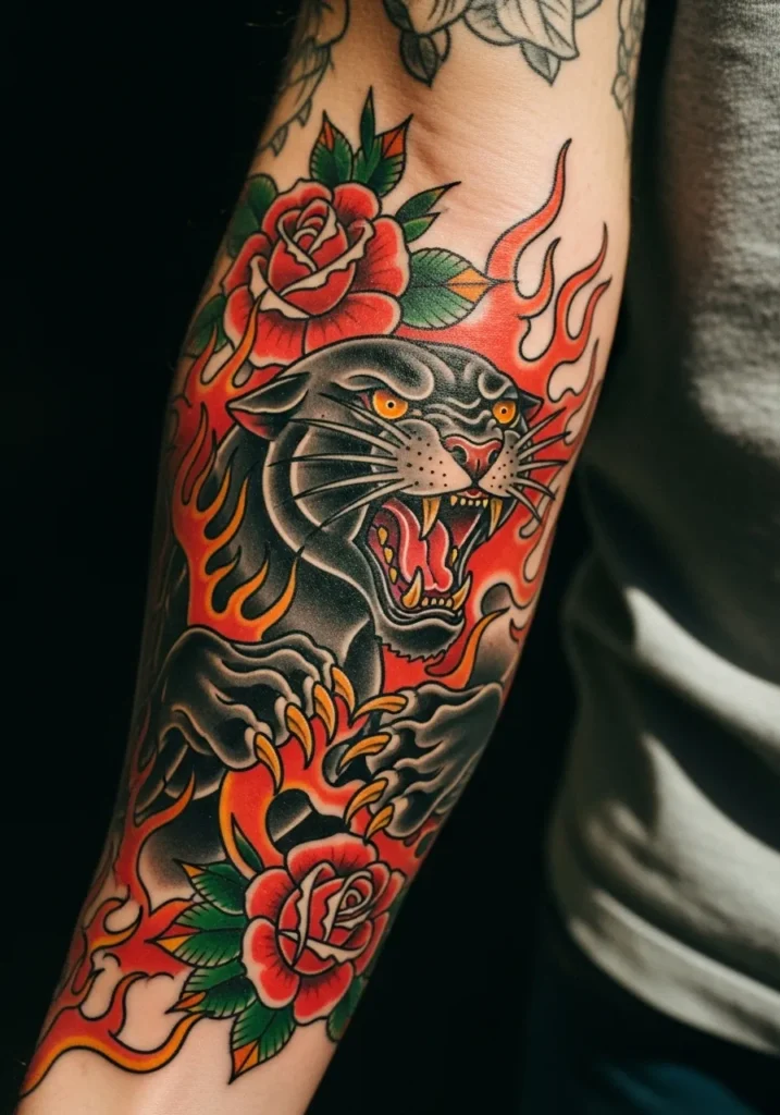 This fiery sleeve design features a roaring black panther surrounded by flames and red roses. The color contrast between the warm reds and the dark fur makes the panther almost leap off the skin. It s bold, saturated, and full of life.