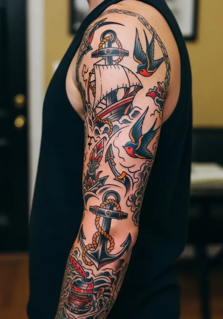 If you re like me and love tattoos with personality and history, these American traditional sleeves are a dream. They re bold, nostalgic, and packed with character in every inch.