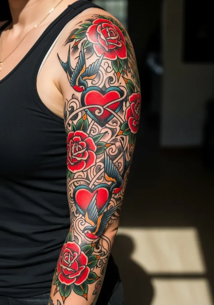 I adore how elegant this sleeve feels while still keeping its old school roots. The hearts and roses just scream timeless beauty, and the swallows add a sweet sense of freedom. It s one of those tattoos that will always look good, no matter the era.