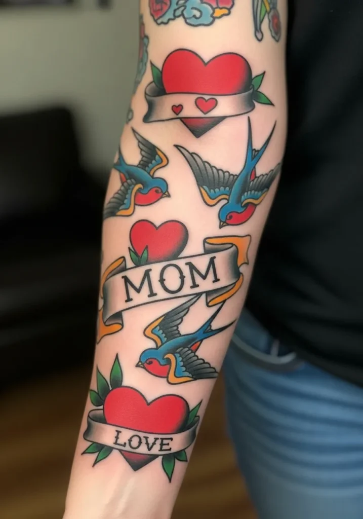 This forearm tattoo keeps things simple and meaningful with traditional hearts, banners, and swallows. The design uses clean black outlines and bright pops of red and blue that make the classic MOM and LOVE banners stand out. The symmetry and spacing give it a charming old-fashioned appeal.