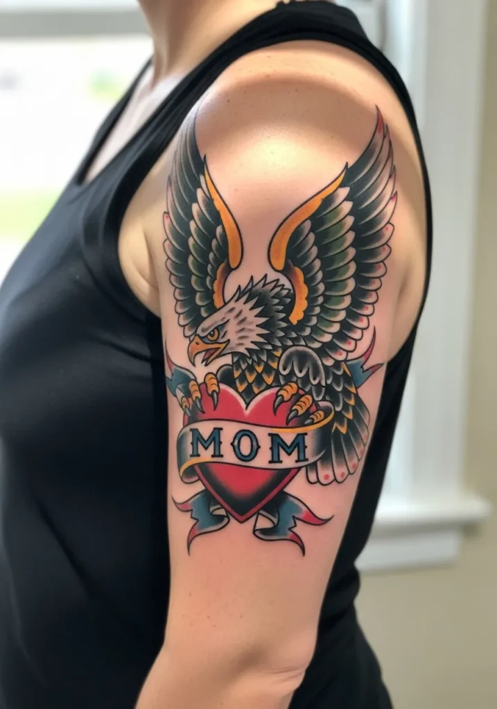 This classic upper arm tattoo features a fierce American eagle spreading its wings above a bright red heart with a banner reading MOM. The old school style is unmistakable with bold black outlines, thick shading, and a rich color palette of reds, yellows, and blues. The design fits perfectly on the shoulder and upper arm, showing clean linework and timeless charm.