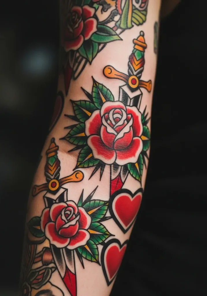 This vibrant sleeve combines red roses, shining swords, and hearts outlined in bold black. Each element sits perfectly balanced, creating a strong visual flow from top to bottom. The greens and reds play beautifully together, while the metallic tones of the daggers add depth and contrast.