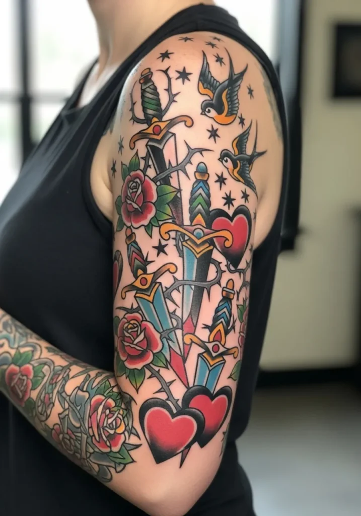 This bold upper arm tattoo features multiple daggers piercing through hearts and roses, surrounded by twinkling black stars and graceful swallows in flight. The mix of sharp blues and reds brings the design to life, while the classic bold outlines and clean shading make it unmistakably American traditional. The layout fills the arm beautifully, giving the sleeve a cohesive, old school look.