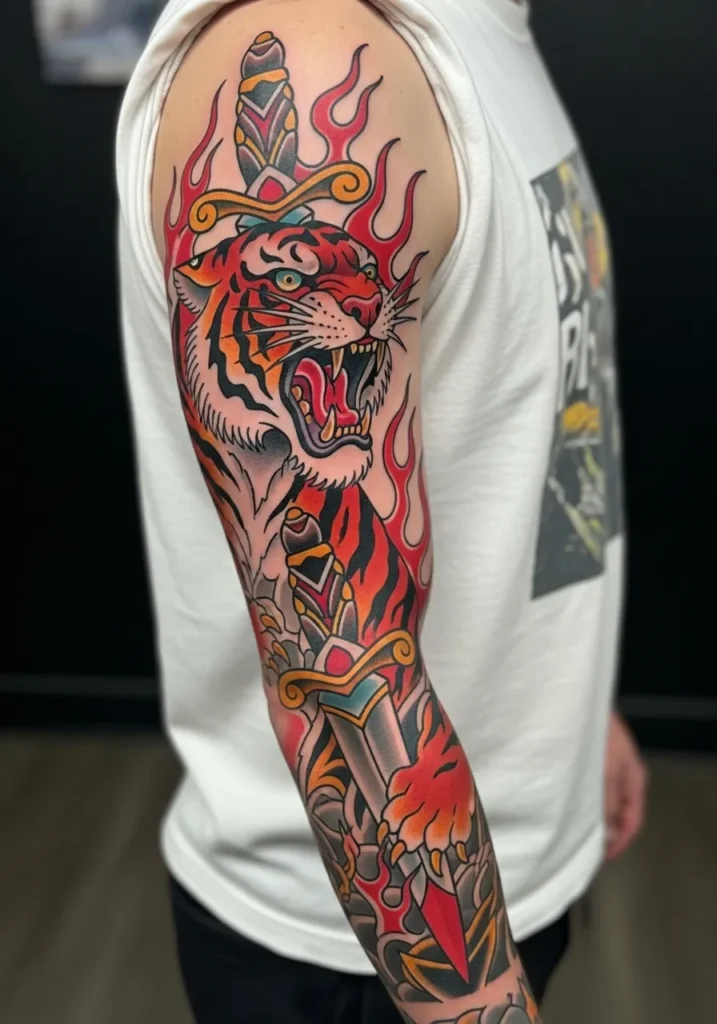 This dramatic sleeve design showcases a roaring tiger pierced by a gleaming dagger surrounded by flames. The mix of orange, red, and gold makes the tattoo feel alive, and the old school style keeps it timeless and bold. The composition stretches beautifully down the entire arm.