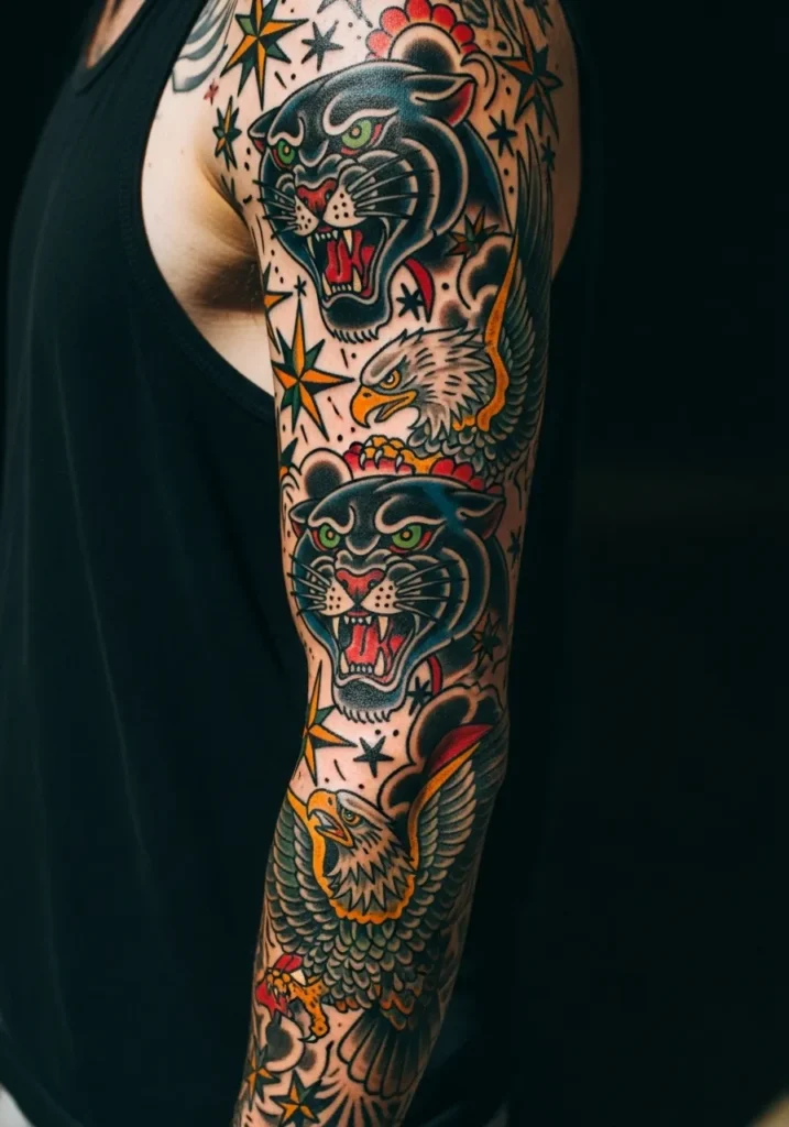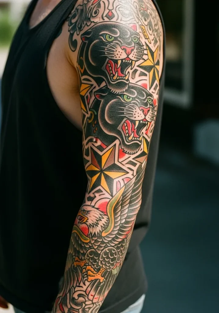 This full sleeve bursts with energy, featuring roaring black panthers, fierce eagles, and golden stars scattered across the arm. Every element is outlined with thick black lines and filled with fiery reds, yellows, and deep greens that make it impossible to look away.