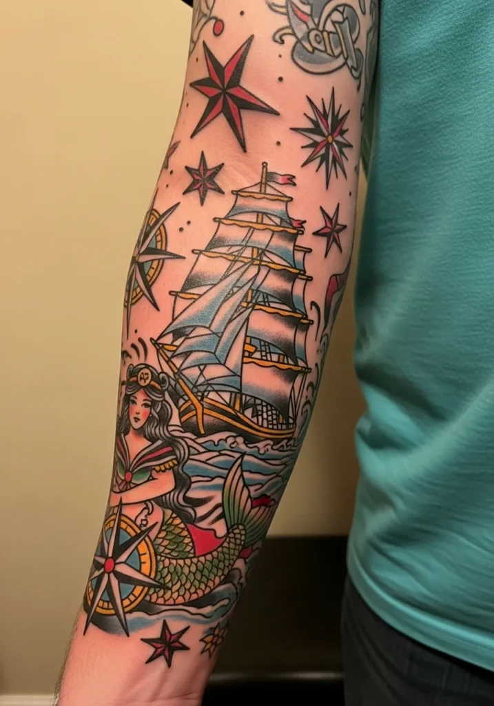 This arm tattoo features a traditional mermaid with flowing hair and a shimmering tail, sitting beneath a tall ship surrounded by nautical stars. The blues and greens blend effortlessly, and the fine black lines give it that perfect vintage look.